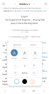 A Holy Bible Recovery Version App a maximális rugalmasságot nyújtja a testreszabott olvasási és tanulmányi élmény érdekében. Könnyedén be- és kikapcsolhatja a kiemeléseket, lábjegyzeteket és kereszthivatkozásokat, így mindig az Önnek legmegfelelőbb beállításokkal böngészheti a Szentírást. A vizuális kényelmet három különböző megjelenítési mód – világos, sötét és szépia – garantálja, csökkentve a szemfáradtságot. A pontos vers- és lábjegyzetkereső funkciók villámgyors navigációt biztosítanak, míg a beépített térképek és diagramok mélyebb betekintést nyújtanak a bibliai földrajzba és történelmi kontextusba. A szövegek másolása, beillesztése és megosztása is egyszerű. A leginnovatívabb funkciók egyike a „Profilok" létrehozásának lehetősége: több „másolatot" hozhat létre a Bibliáról különböző célokra, mindegyikhez saját olvasási előzménnyel, jegyzetekkel és navigációval, legyen szó akár minden forrást tartalmazó átfogó, akár egy letisztult és egyszerű tanulmányi környezetről.