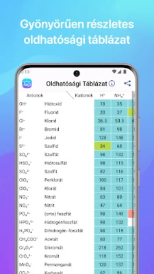Nem csupán egy egyenletmegoldó, A Kémia alkalmazás a legfontosabb referenciaeszközöket is a zsebébe varázsolja. Az interaktív periódusos rendszer, amely többféle stílusban – klasszikus, modern és hosszú – is megjeleníthető, alapvető támpontot nyújt az elemek tulajdonságaihoz és viselkedéséhez. Kiegészítésül az oldhatósági táblázat, az elemek elektronegativitási diagramja és a fémek reaktivitási sorozata mind részletes betekintést nyújtanak az anyagi világba. Minden adatpont könnyedén nagyítható és kicsinyíthető, biztosítva a tökéletes áttekintést és a gyors hozzáférést a leglényegesebb információkhoz.