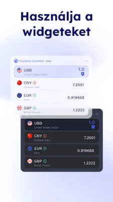 Ez az egyszerű, ingyenes valutaváltó alkalmazás élő árfolyamokkal és offline móddal segíti Önt. Könnyen kezelhető konverziós kalkulátor, amellyel több mint 180 külföldi valuta és népszerű kriptovaluta értékét számíthatja ki pontosan, bárhol és bármikor.